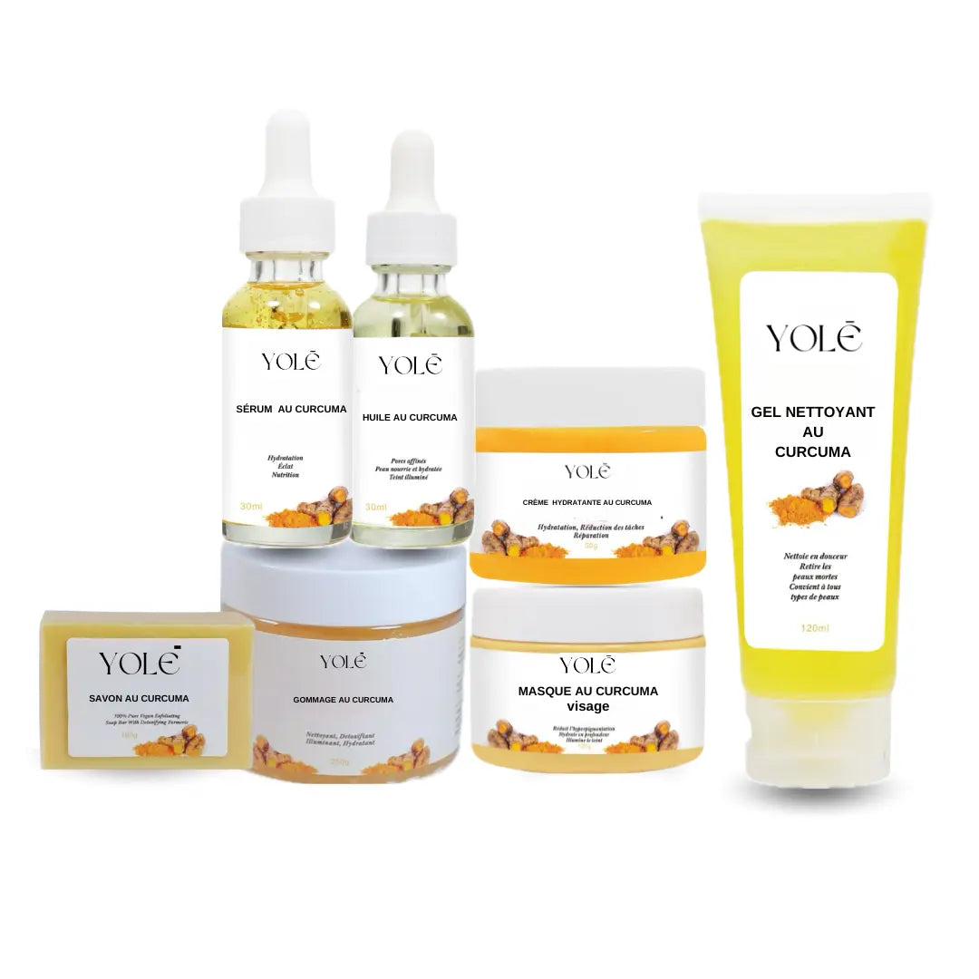 La gamme complète au curcuma anti tâche contient : 1 Gel nettoyant au curcuma 1 Masque curcuma 1 Gommage au curcuma 1 Sérum curcuma 1 Huile nourrissante curcuma 1 Crème hydratante au curcuma